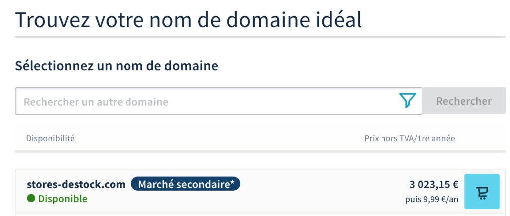 Choix : entre les deux j’ai choisi WEBDROP car il est facilement mémorisable, pas de tiret (j’avais avant stores-destock.com un site où je vendez des stores bannes en dropshipping que j’ai stoppé pour lancer Webdrop). Stores-destock m’a un peu refroidi sur les tirets car au téléphone c’est un peu long à dire (oui ça m’a pas empêché de lancer webdrop-market.com, j’ai quand même acheté sans tiret :D).